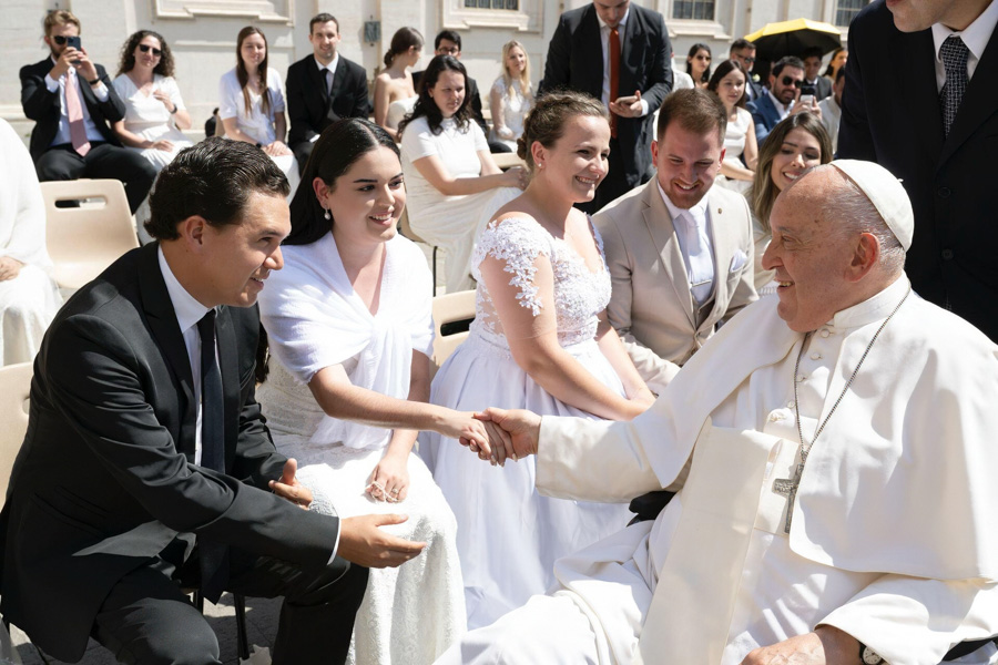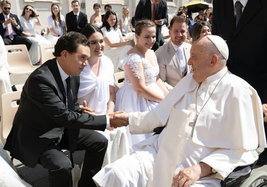 Los jóvenes esposos Eliza María Panayotti Peña de Suárez y Mateo Suárez Bueno tuvieron audiencia con Su Santidad al poco tiempo de contraer nupcias en 2023. «Estar ante su presencia y sentir su paz fue profundamente conmovedor. Recibir su bendición para nuestro matrimonio es un regalo que llevaremos en el corazón por siempre»