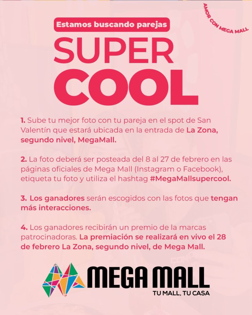 Al subir el post, debe usar el hashtag #MegaMallSupercool para formar parte de la actividad y poder ganarse infinidad de premios.