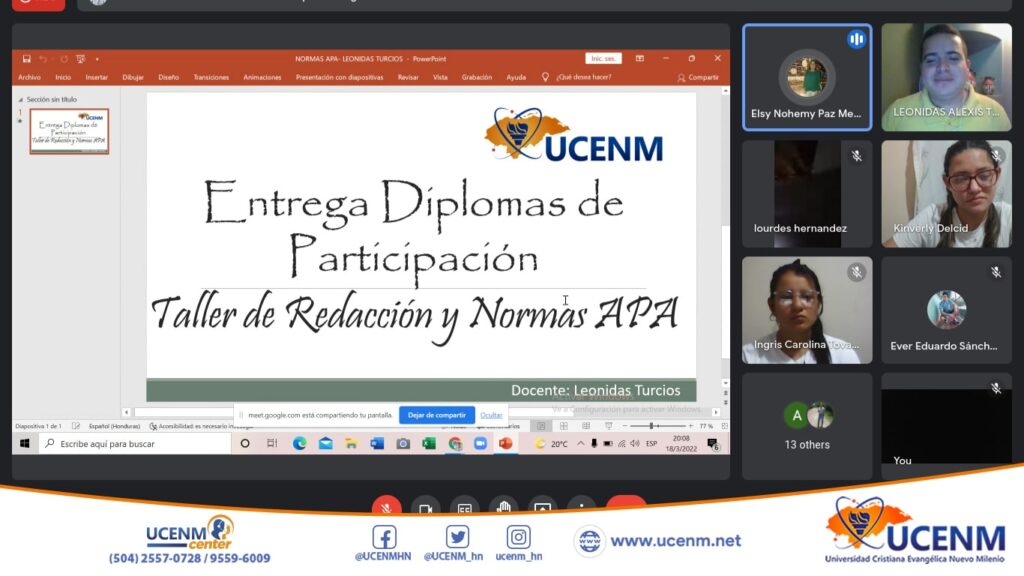 El taller de redacción y normas APA UCENM ha durado 12 horas. Desde el 26 de febrero hasta el 18 de marzo de 2022.