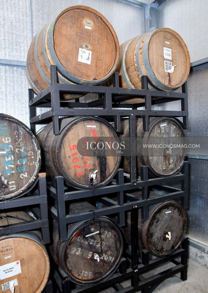 El sistema de barriles tipo cascada de Clandestino permite que el ron joven se añada en niveles superiores, mientras el más añejo descienda lentamente, una técnica que mezcla sabores hasta llegar al tanque final de blending.