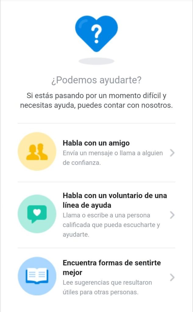 Seguidamente aparece una ventana con dos opciones: Obtener ayuda y Mostrar publicaciones. Al seleccionar la primera, se redigirá al centro de ayuda donde la persona podrá decidir entre varios tipos de apoyo según su estado emocional.
