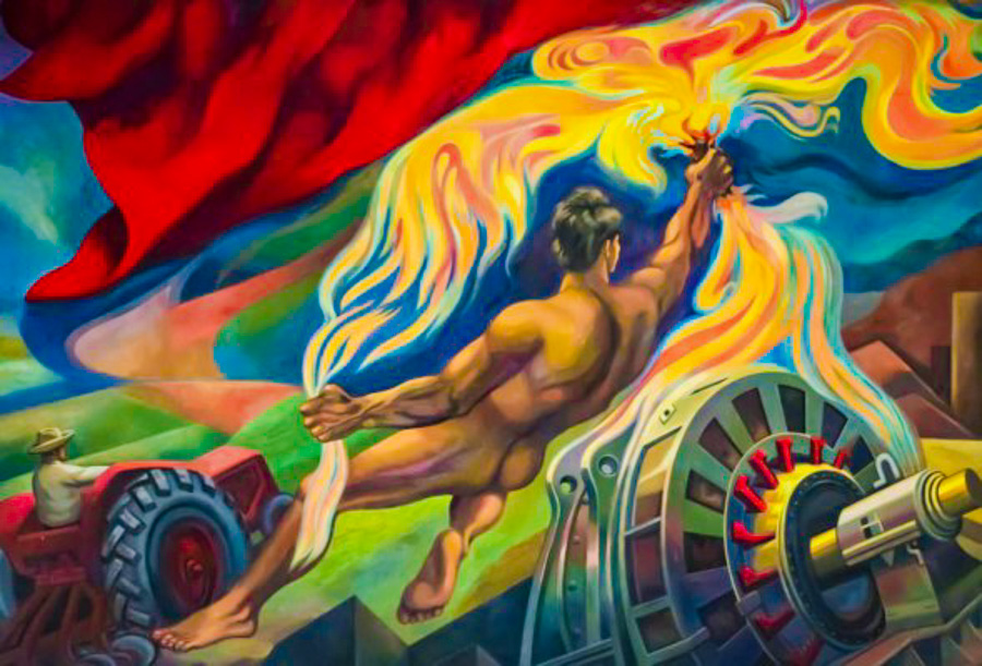 En ese mural, la obtención del conocimiento es representado por una flama que es dominada por un cuerpo desnudo, fornido y esculpido a pincel que se asemeja a Prometeo de la mitología griega.