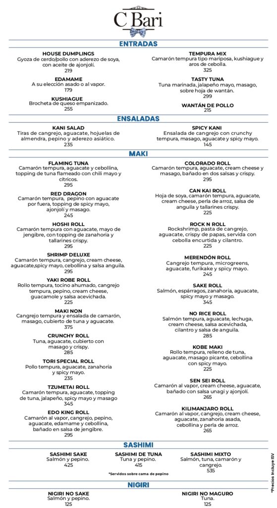 Ofrece sus famosos platillos que van desde deliciosos mariscos, finos cortes de carne y sabores japoneses.