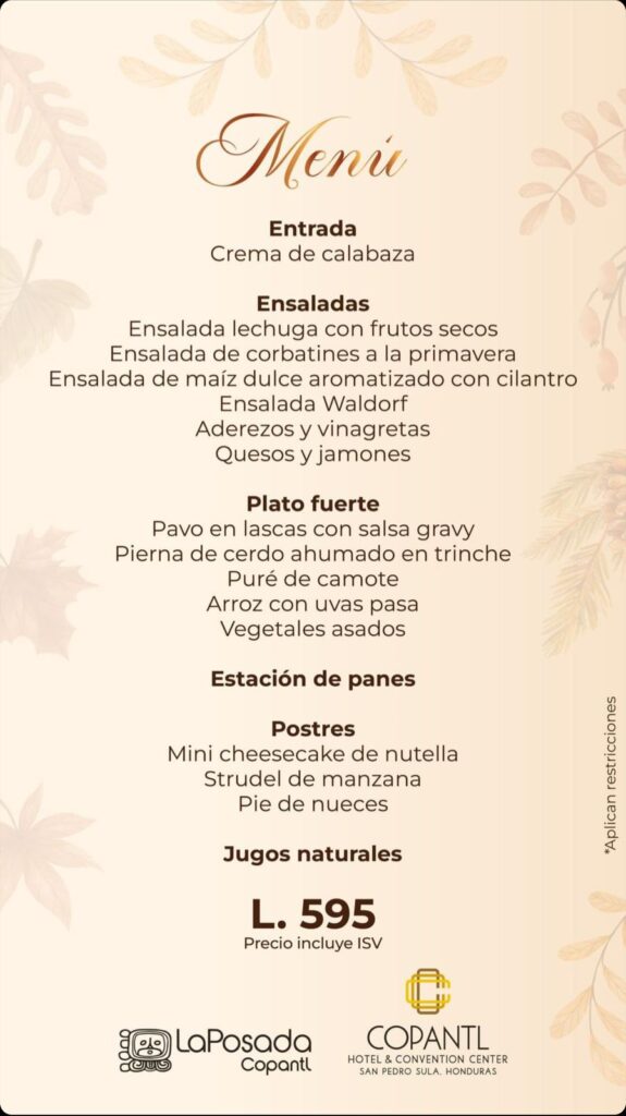 San Pedro Sula. El hotel Copantl San Pedro Sula presenta su exquisito menú Thanksgiving Day 2023 by hotel Copantl Honduras para disfrutar en la esperada fecha de Acción de gracias.