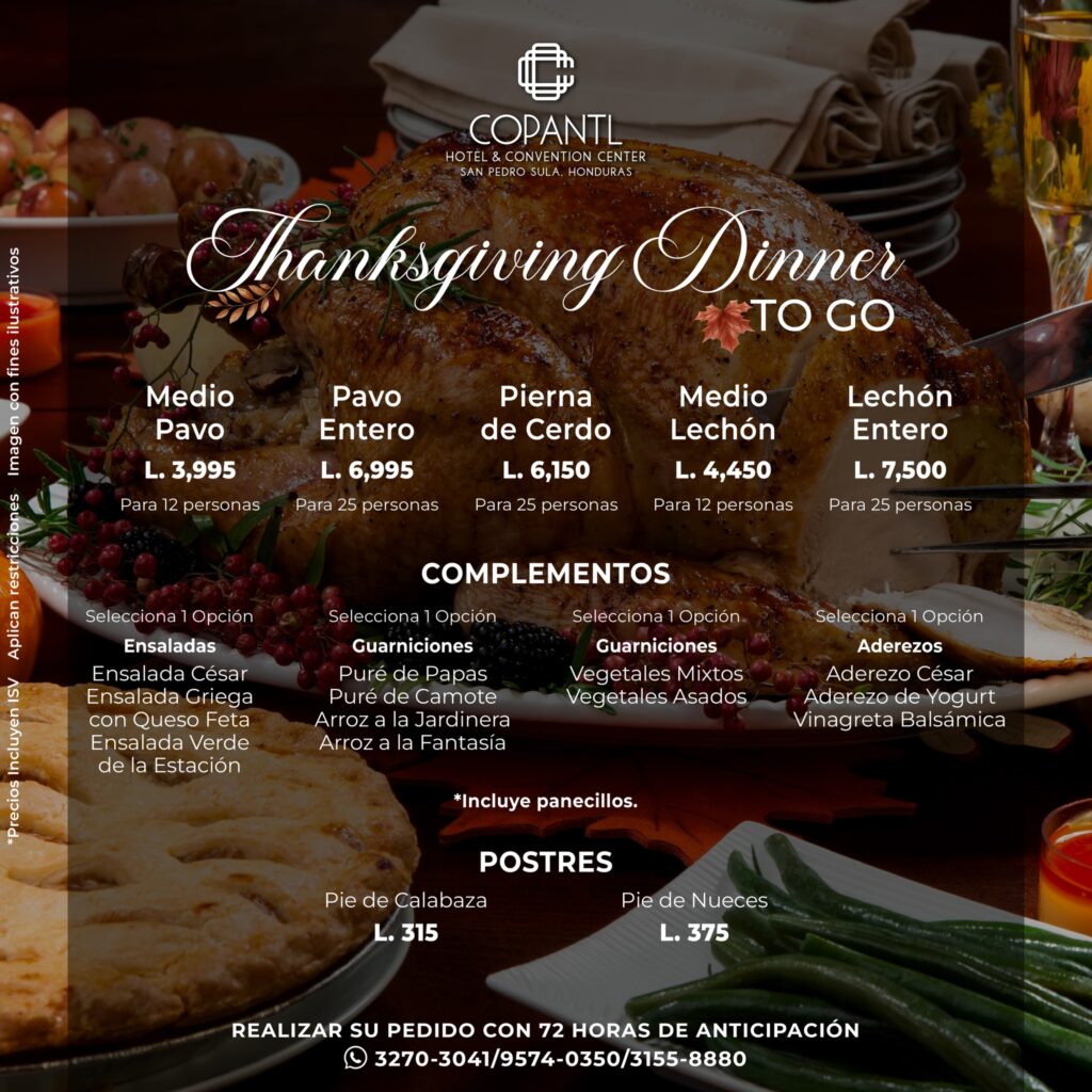 Para más información o reservación para el Thanksgiving Day 2023 by hotel Copantl Honduras puede comunicarse a los números telefónicos 3270 – 3041 9574 – 0350 3155 – 8880.