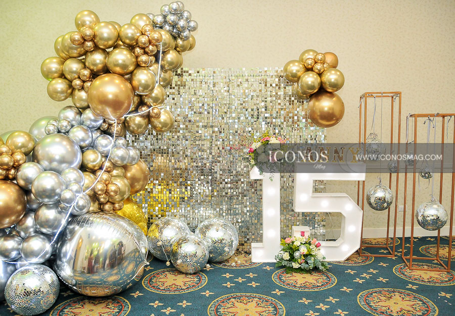 Shirley Dayana Solís y ⁠Yenni Pérez han creado la puesta en escena de la agasajada con una ornamentación con temática disco ball.