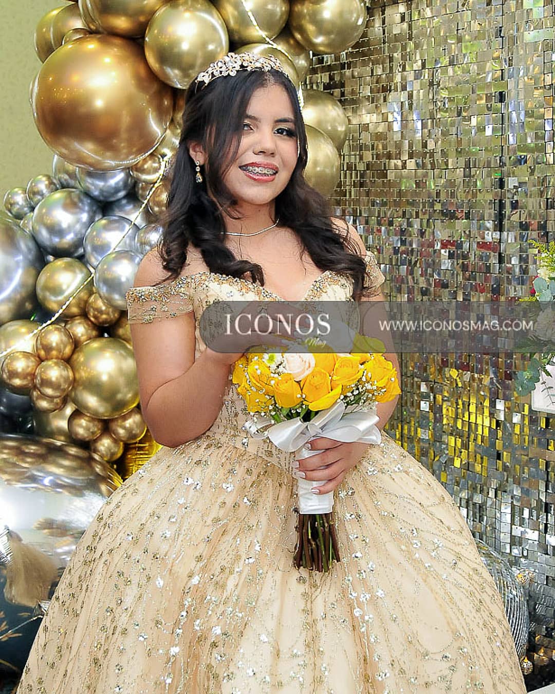 Anny ha lucido un vestido escote corazón en corset incrustado en pedrería con una falda corte princesa en color golden adquirido en tienda Arlet.