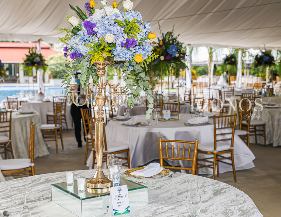Además, impecable mesa revestida de mantelería off white complementada con sillas Tiffany golden.