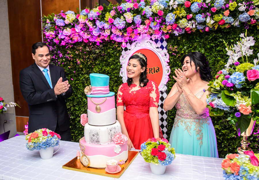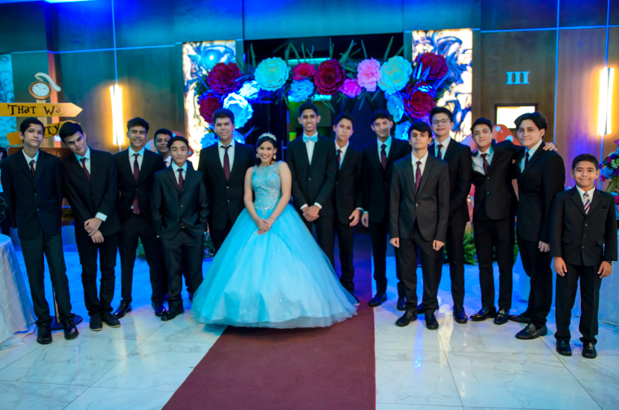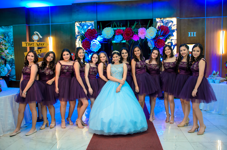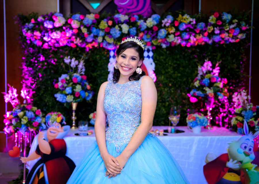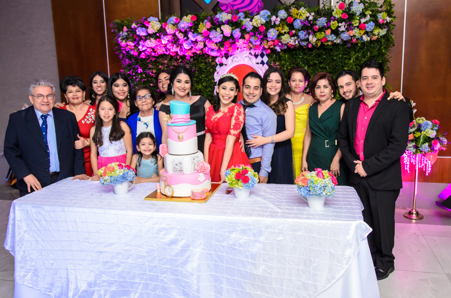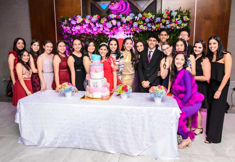 San Pedro Sula. La quinceañera Leny Valeria Pineda debutó en sociedad en una inolvidable celebración, bajo la temática de Alicia en el país de las maravillas.