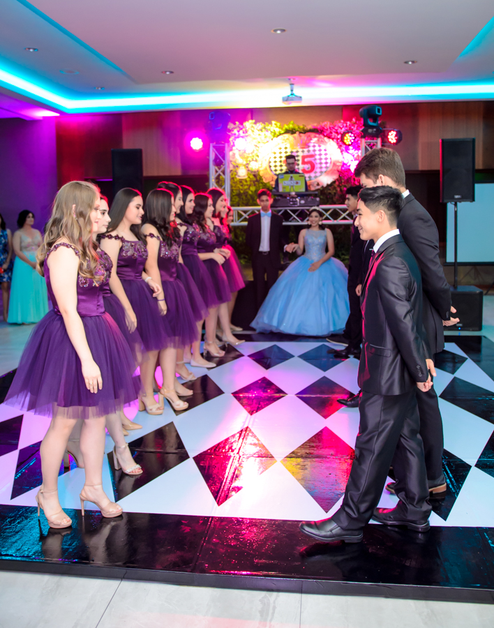 Leny Pineda tuvo el tradicional cortejo, con la presencia de 12 damitas y 12 caballeros, quienes lucían elegantes para la especial ocasión.