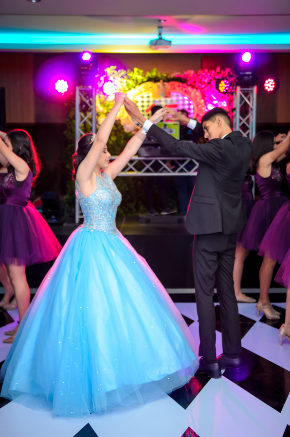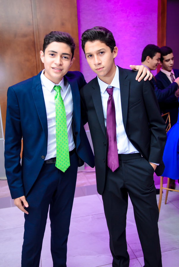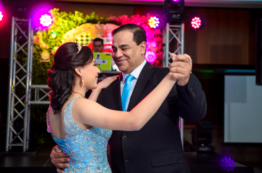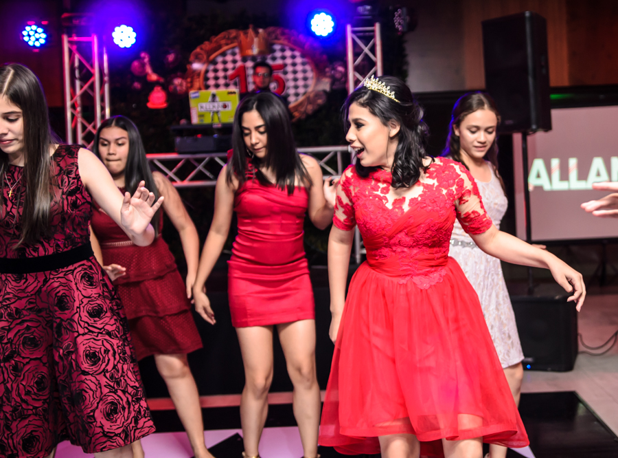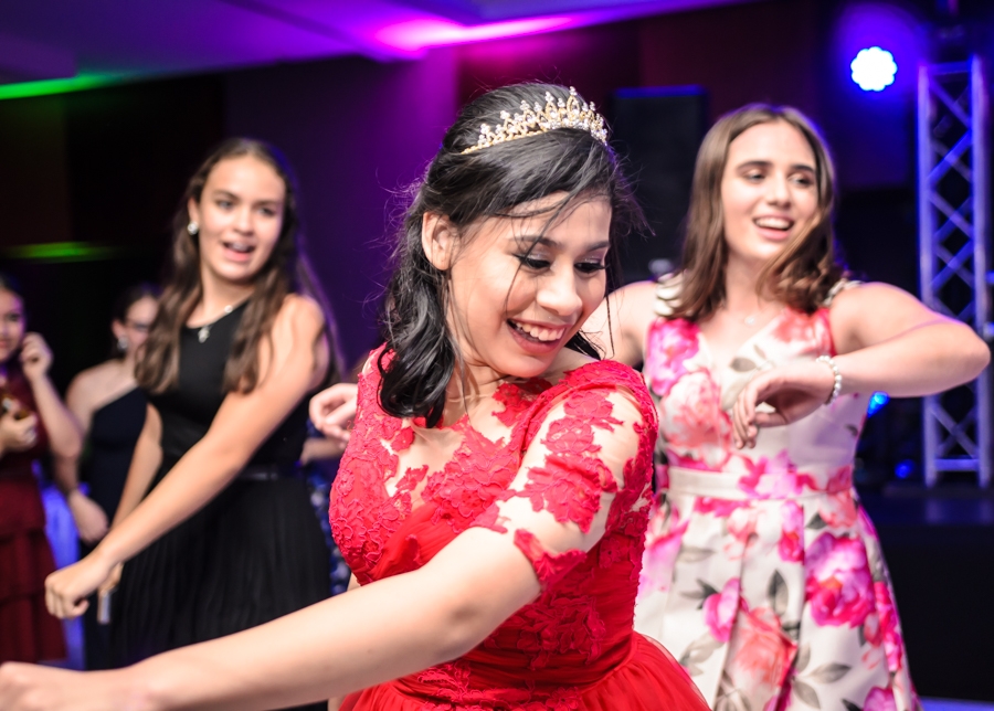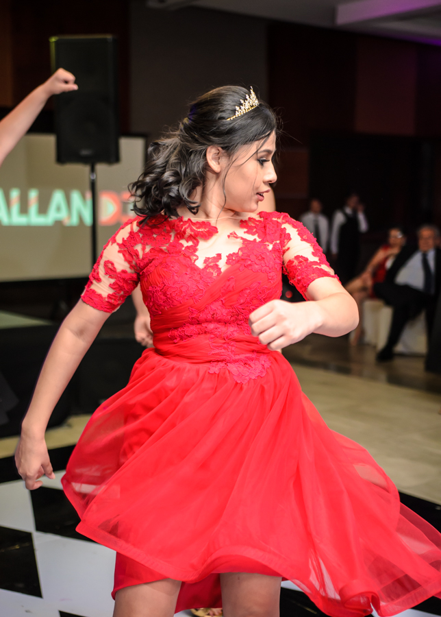 Luego del show la quinceañera optó por un vestido rojo y elegante, con el cúal disfrutó bailando y divirtiéndose con sus compañeros de la Seran School.