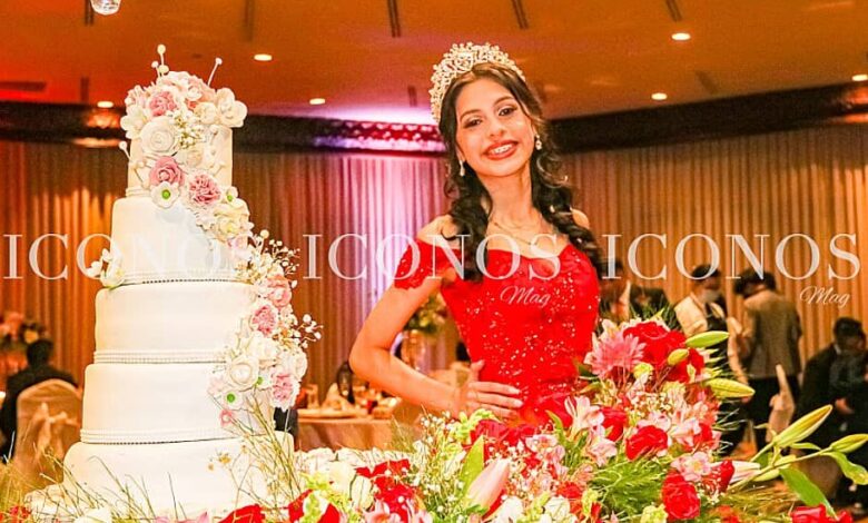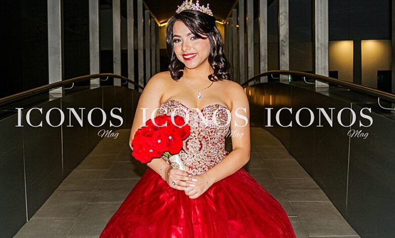 Para su fiesta la quinceañera ha lucido un vestido falda princesa color rojo y encaje dorado