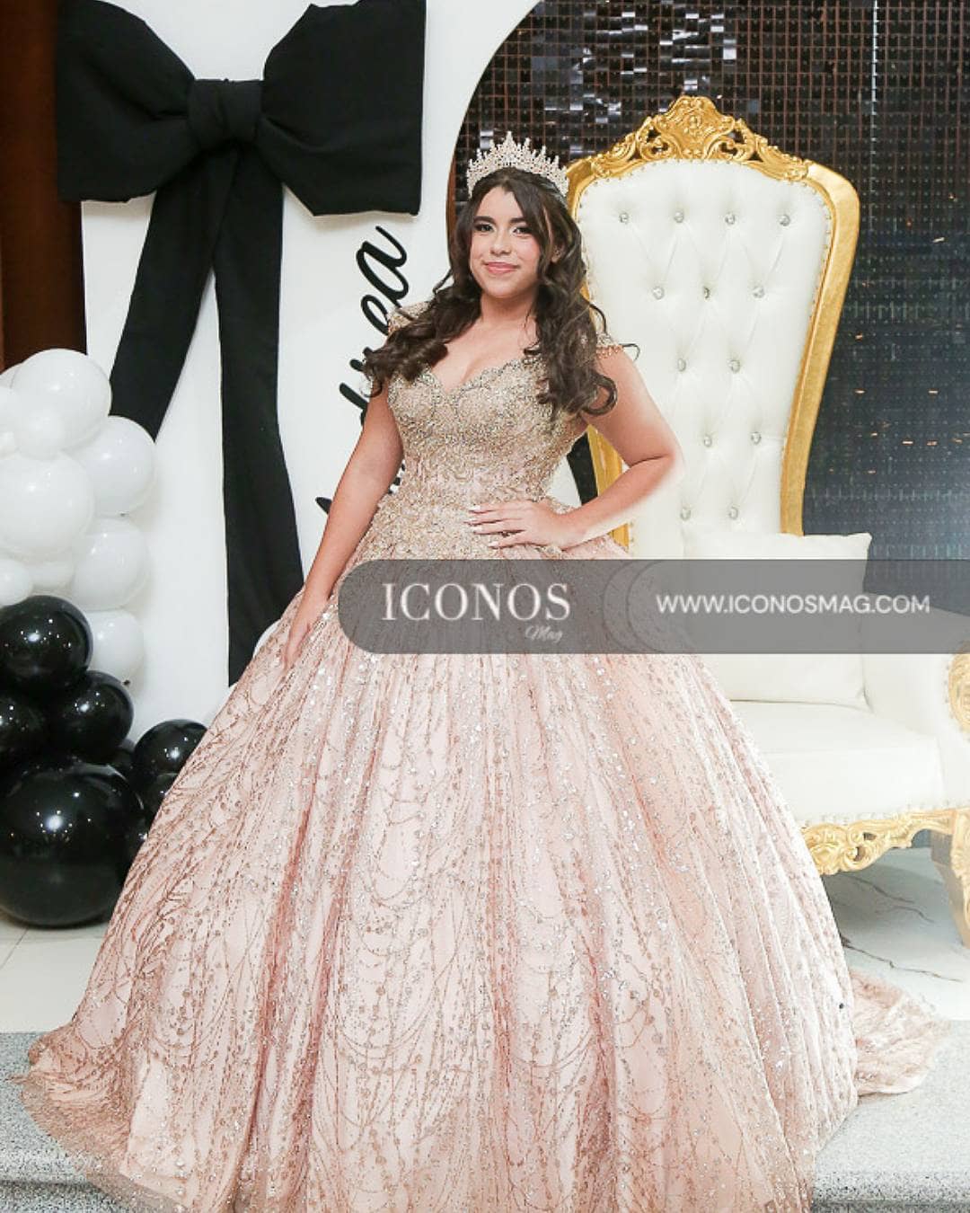 El diseño escote corazón y una amplia falda de princesa en tono rosa con lentejuelas golden todo contemplado con elegancia.