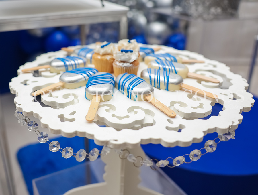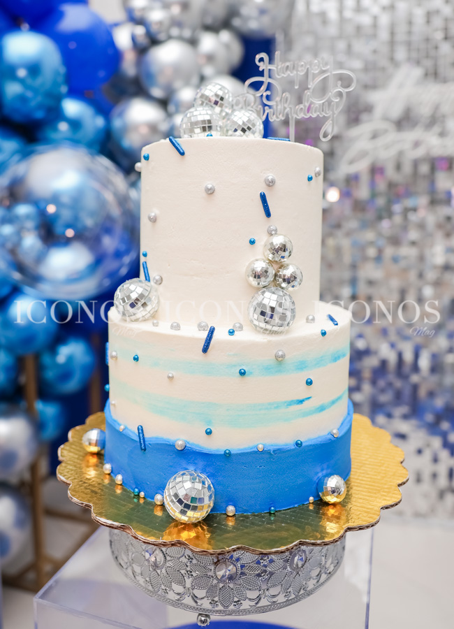 También se ha dispuesto un cake color blanco y blue con detalles de bolas disco de la pastelería Treat’s boutique.