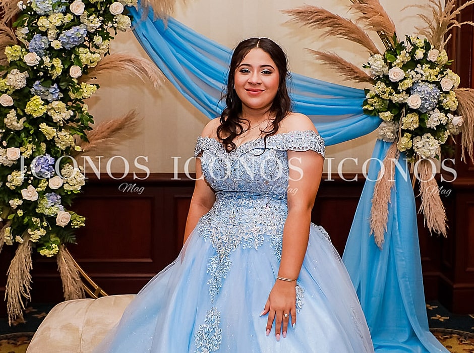 Cesia ha optado por un vestido de la boutique Mundo Quinceañera en corte A celeste off shoulders que ha encantado por los detalles de pedrería boreal y la delicada seda.