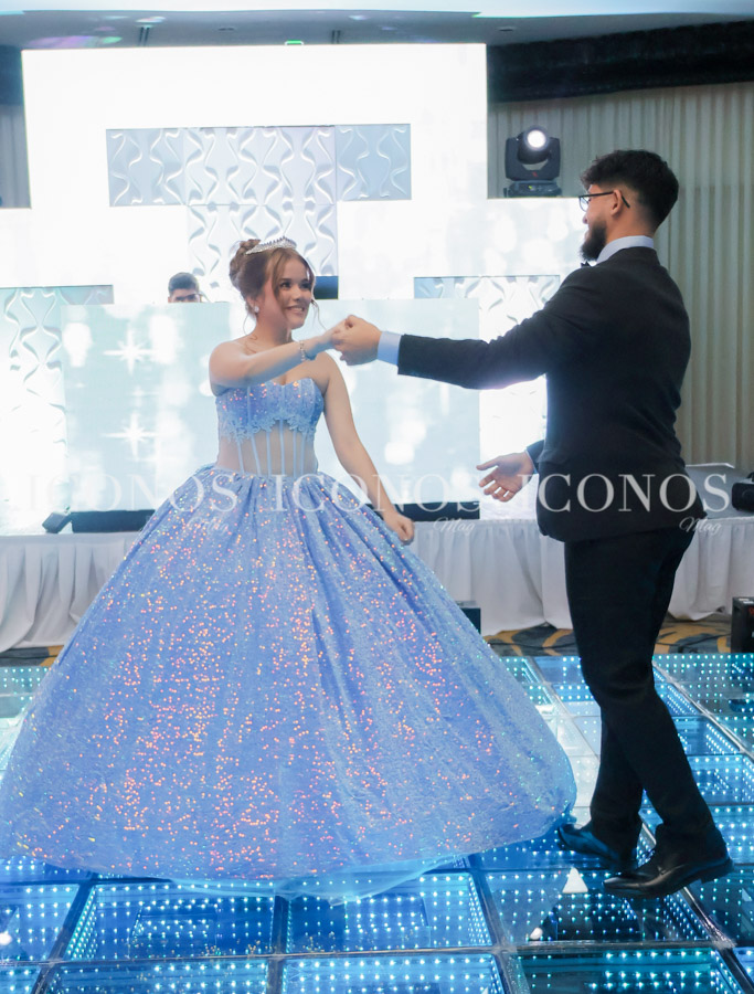 La fiesta ha iniciado con la entrada de Julliana acompañada del chambelán Sebastián Lazo, primo de la agasajada. Ha robado miradas con su hermoso vestido azul.