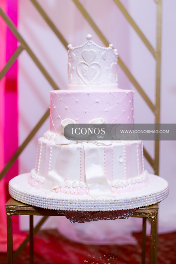 El cake es de tres pisos con corona y lazos diseñados en fondant by Pan y más. Además un amplio menú de mócteles al gusto.