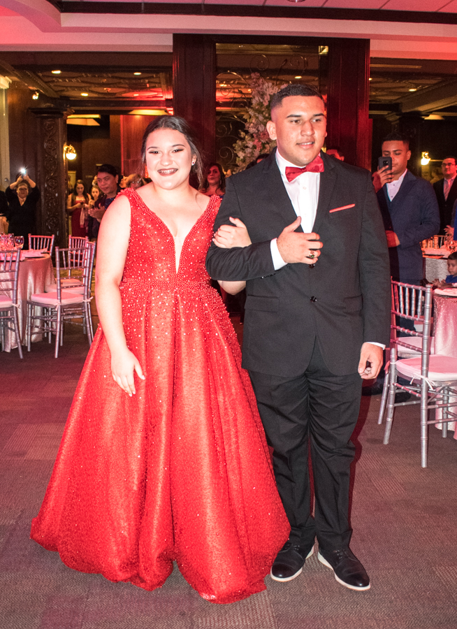 La quinceañera Mayra Castro Budde fue el centro de las miradas, al arribar a la celebración, con un clásico diseño de amplia falda y entalle con escote en V, en audaz color escarlata con sutiles brillos.
