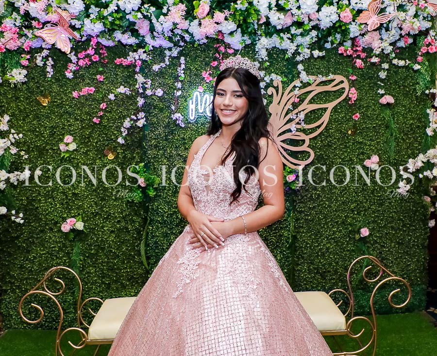 También ha destacado un backdrop con delicadas mariposas, flores y follaje de botánica permanente, donde ha sobresalido la frase Mis 15 en luz led.