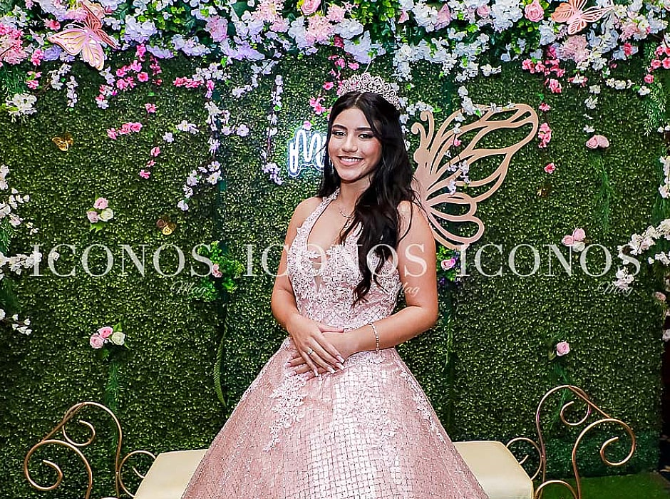 También ha destacado un backdrop con delicadas mariposas, flores y follaje de botánica permanente, donde ha sobresalido la frase Mis 15 en luz led.