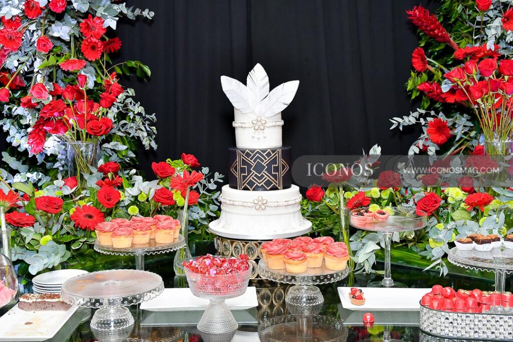 También, ha disfrutado de una mesa de repostería, postres y un cake de tres niveles en color blanco y negro creación de NY FOODS.