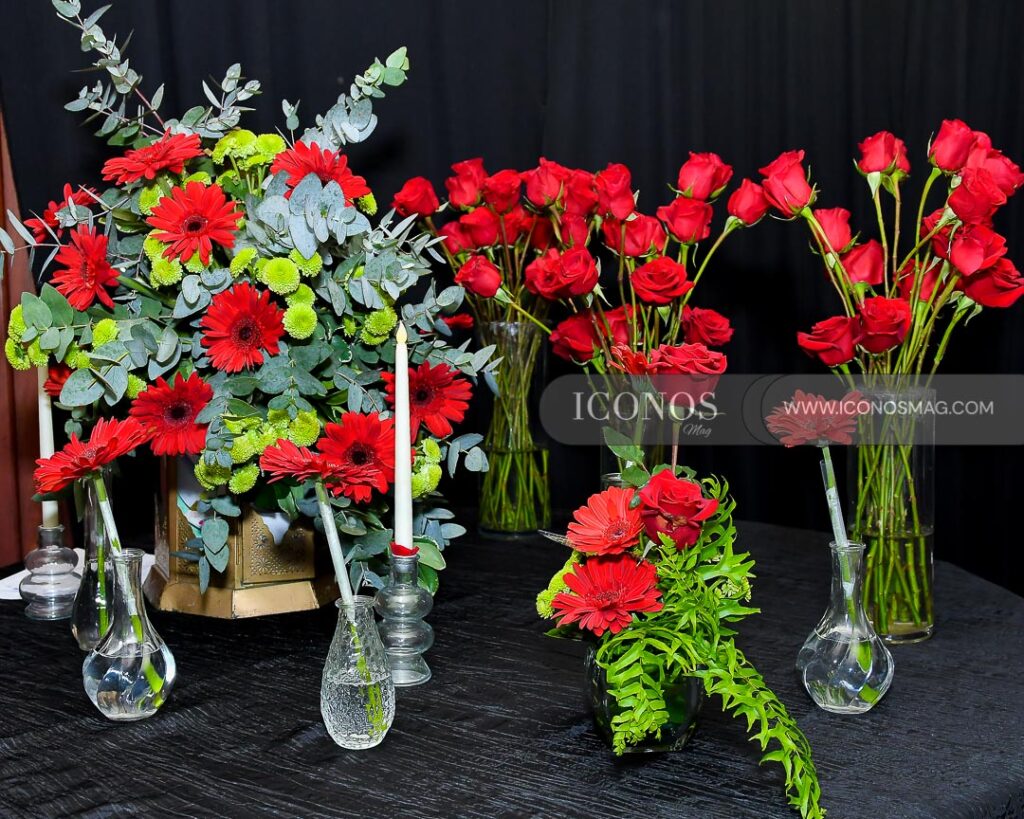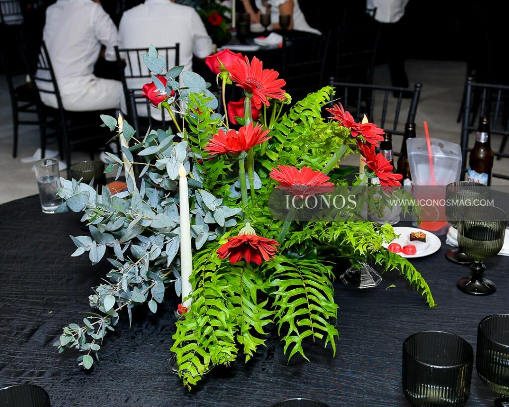 En la recepción se ha utilizado el color negro en el que han resaltado rosas, gerberas rojas con abundante follaje.