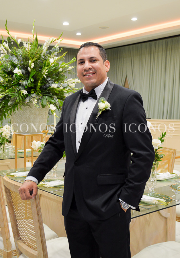El novio ha optado por un traje de noche, pantalón y saco black con una camisa white, corbatín y un boutonier de flores blancas que lo han engalanado.