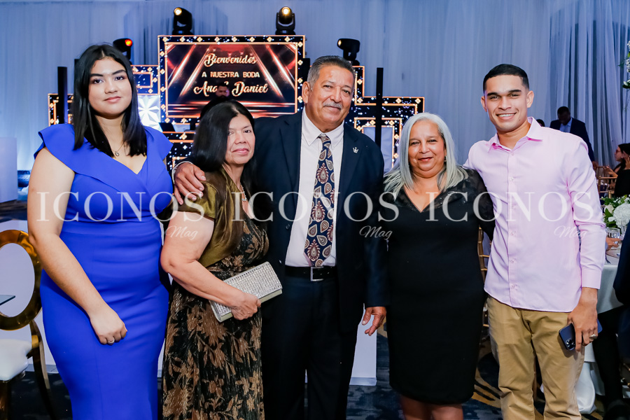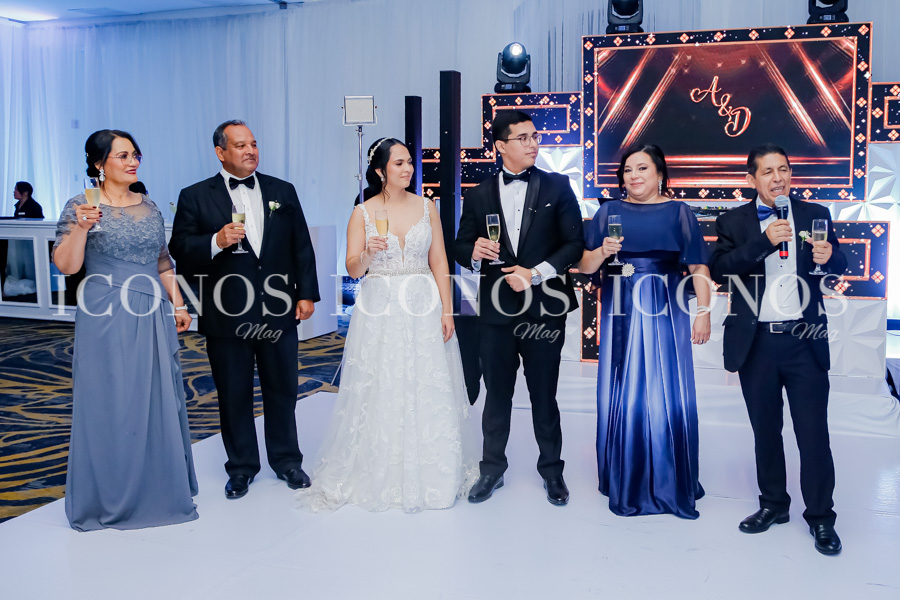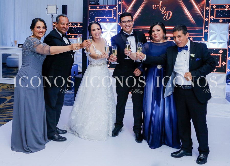 Los padres de la novia Ana Lourdes González Ruiz y Marco Antonio Espinoza Rivera; y los del novio Doris Migdania Sánchez Torres y José Anibal Pineda Barrientos, han acompañado a sus hijos durante el brindis.