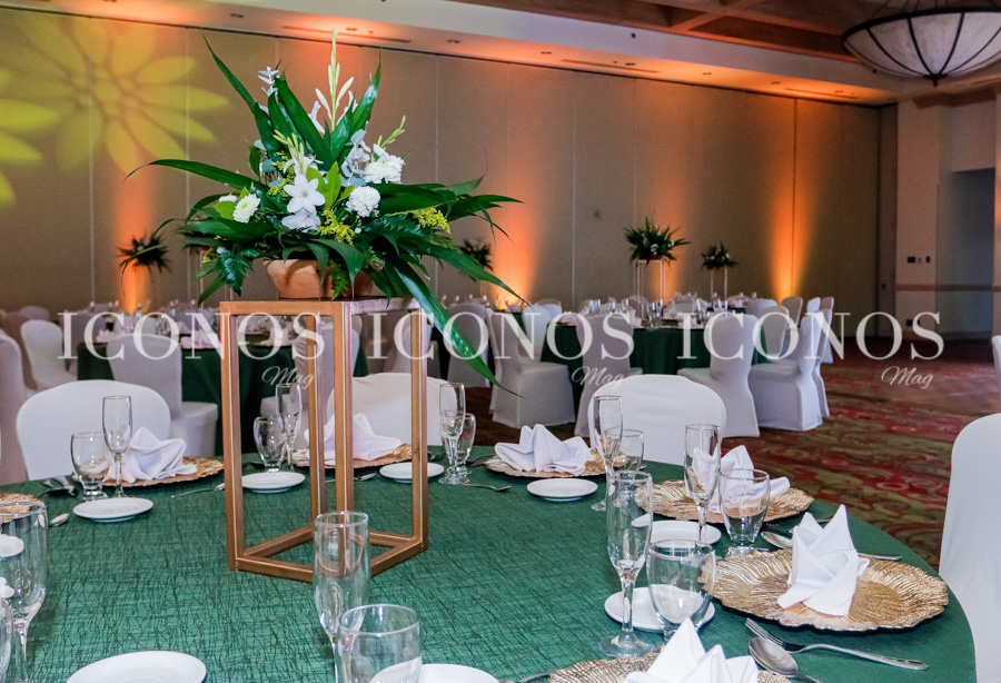 En cuanto a la ornamentación, en cada mesa redonda se han dispuesto arreglos florales compuestos orquídeas, rosas white, eucalipto y follaje de trópico.