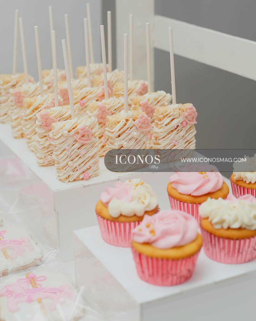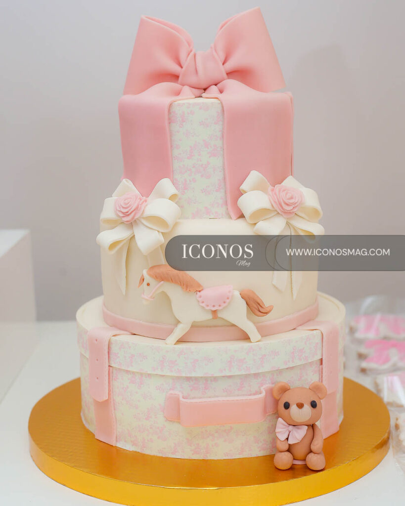 Además, los asistentes han degustado de un exquisito cake de tres niveles adornado con un moño de fondant, osito y caballo de carrusel.