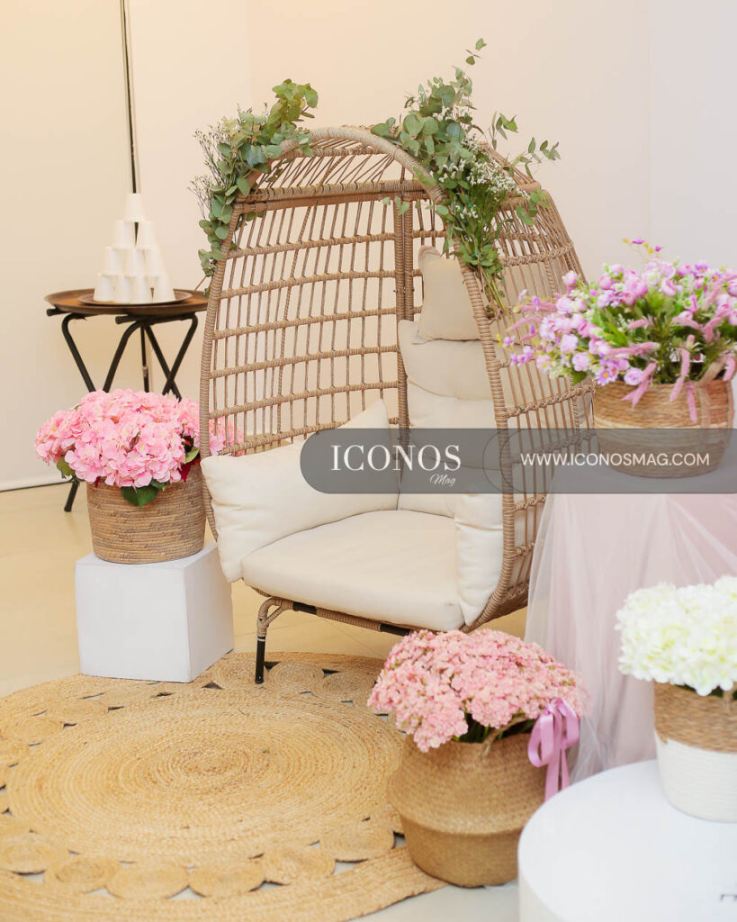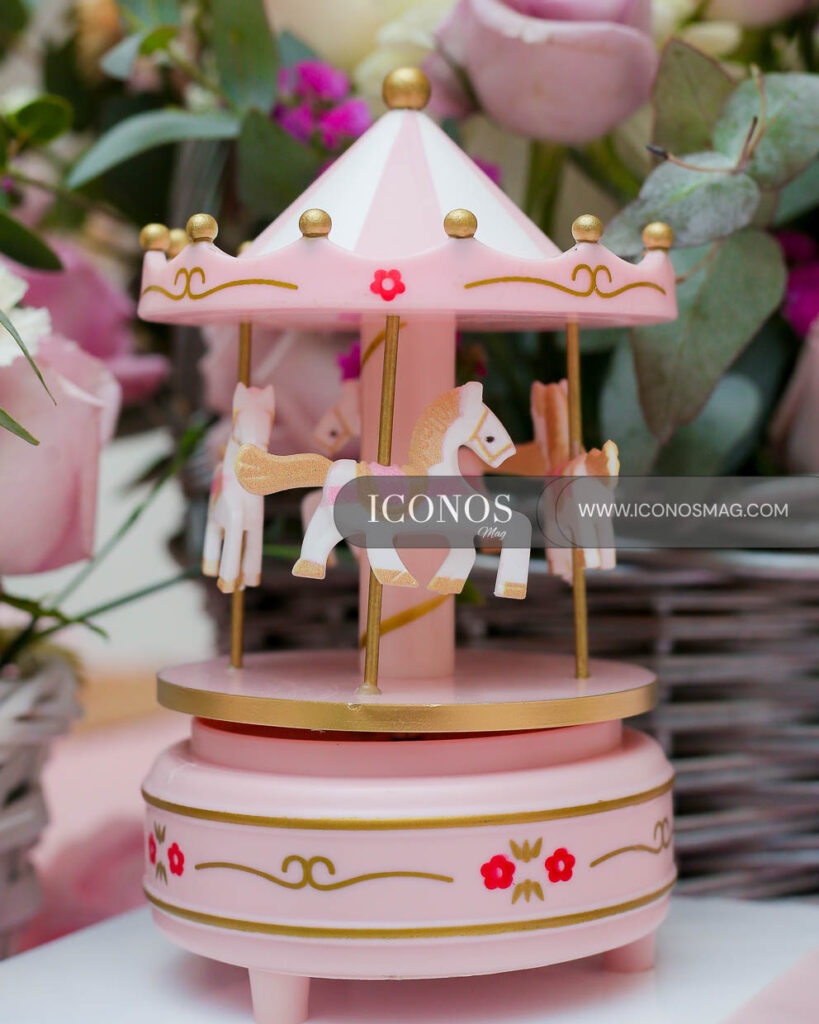 El staff de Letras y más han ornamentado la recepción con candy bar, carrusel de caballitos y globo aerostático con una amplia cesta de mimbre para los detalles de Amelia.