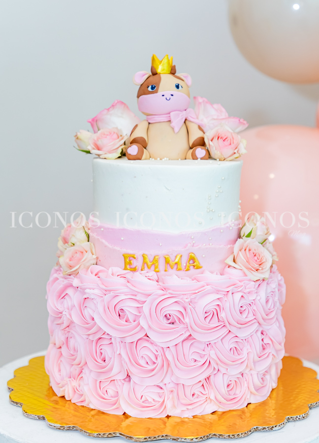 Además, un backdrop ornamentado con globos rosados, café, flamingo y blancos, standees de vacas y una cesta con espigas.