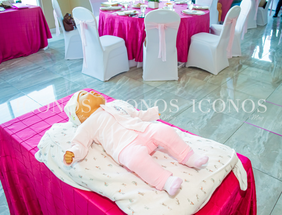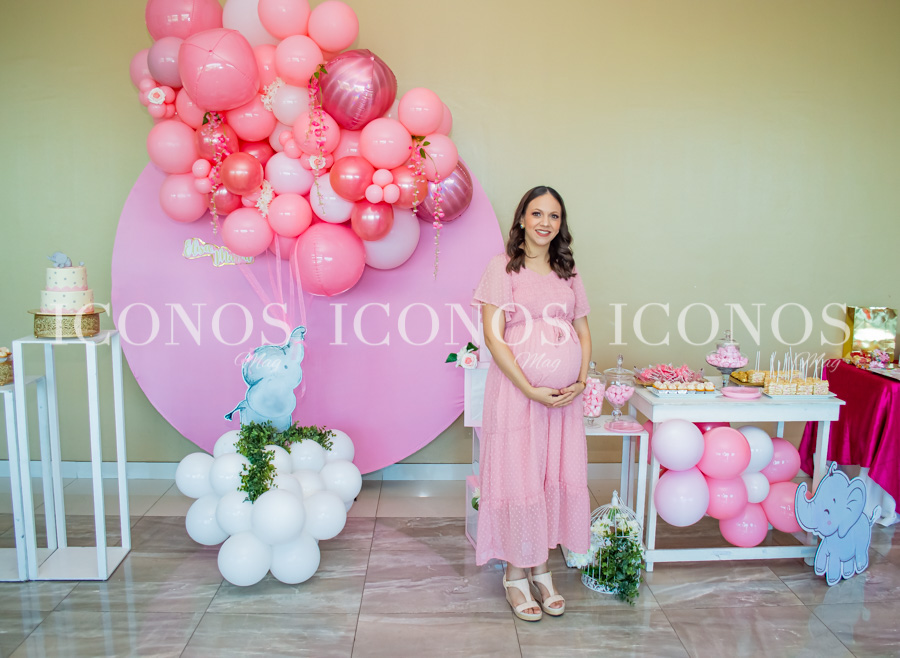 Para la ornamentación se ha agregado un backdrop stand con globos de diferentes tonos rosa. Además, una pastry table con exquisitos postres que ha encantado a todas.