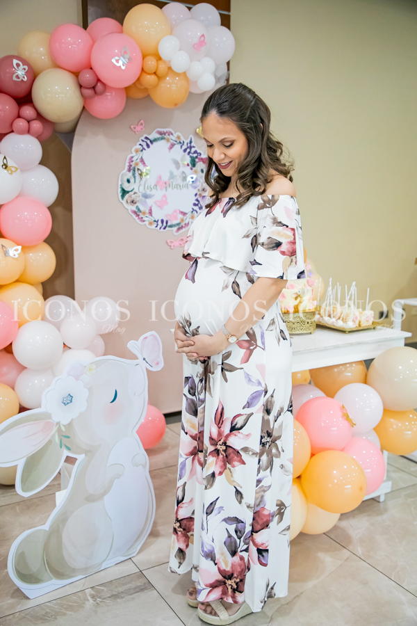 Además, un backdrop con globos de color rosa, fucsia, naranja y blanco ornamentados con mariposas multicolores, un standee de un conejo y variedad de canapés.