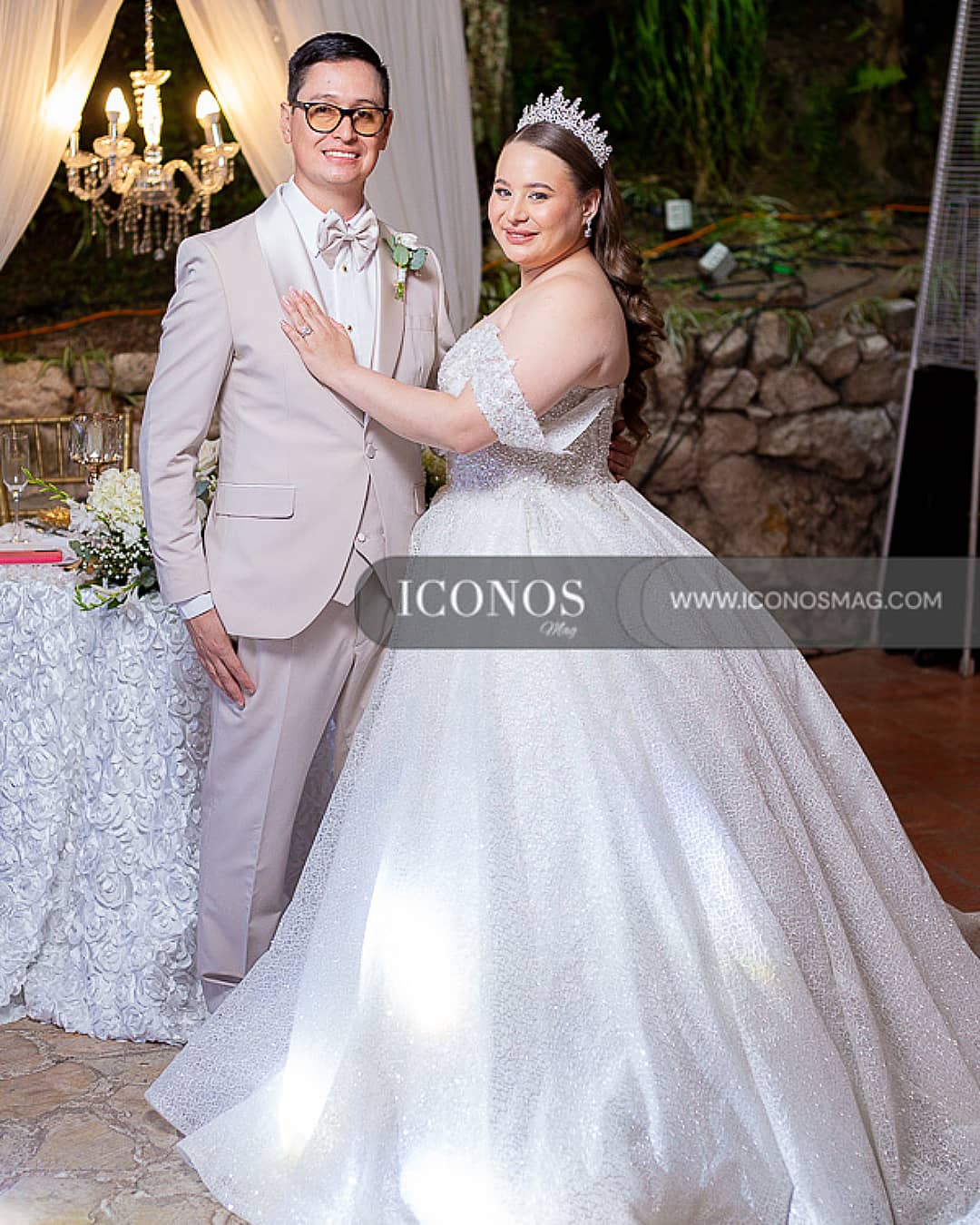 La novia ha lucido un vestido con escote palabra de honor, hombros caídos, top con pedrería. La falda es corte amplio y voluminoso. Todo en tono silver, ha complementado su look con una tiara de incrustaciones.