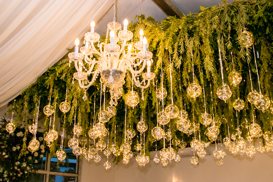 Han enmarcado su felicidad con un torrente floral natural que se desprendía del techo y se combinaba con burbujas de cristal con luces de hadas.