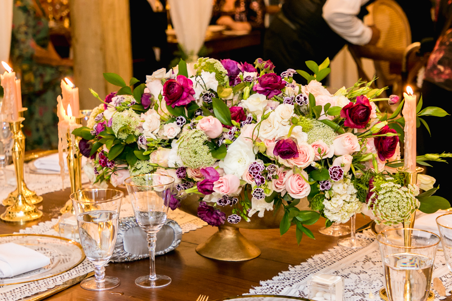 Además, la diseñadora floral Jackeline Cabrera hizo la producción decorativa con bases de vidrio y espectaculares esferas de rosas, peonías a escala, hortensias, follaje y acentos en tono mulberry y orchid.
