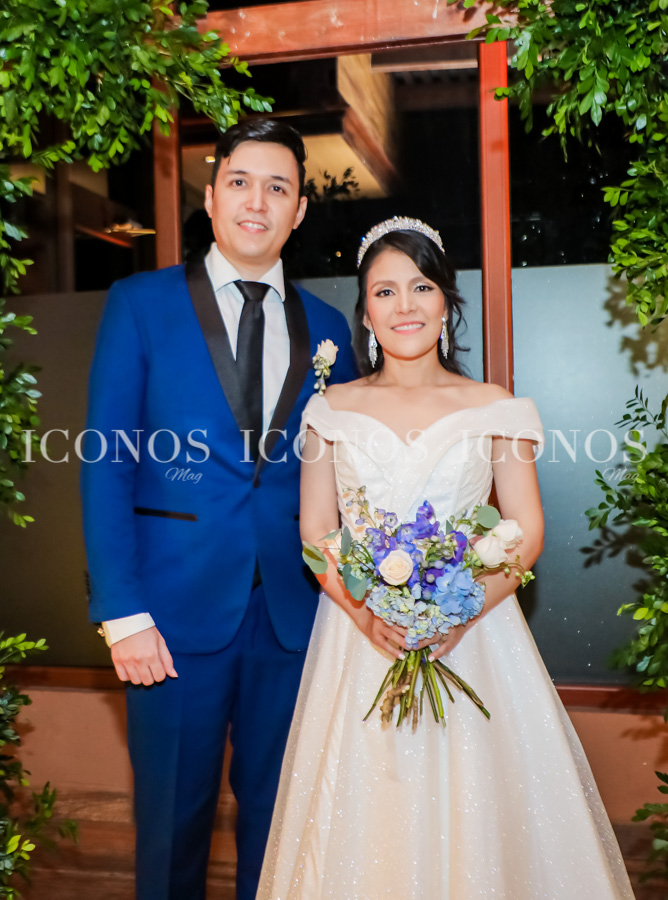 La novia ha lucido un vestido blanco con escote Bardot y de falda en línea A. El novio ha optado por un traje de vestir en tono azul eléctrico de London brides & Tuxedos.