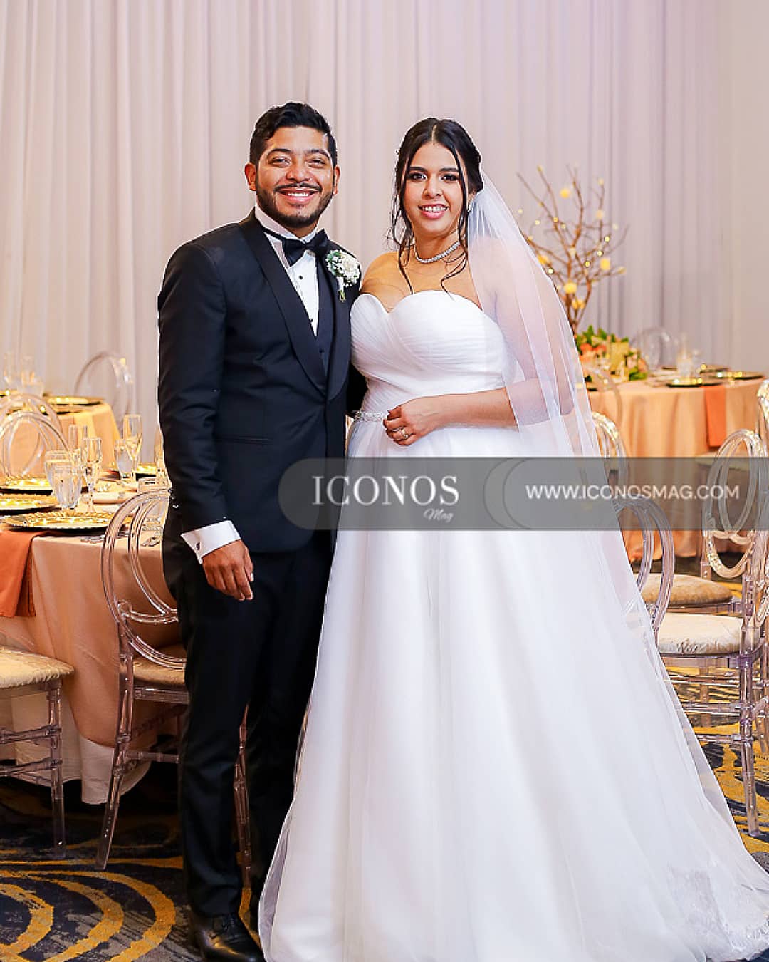 La novia ha lucido un vestido con escote corazón, top drapeado y amplia falda de tul con detalles en pedrería para resaltar la silueta de la agasajada. Complementa su look con un velo catedral.