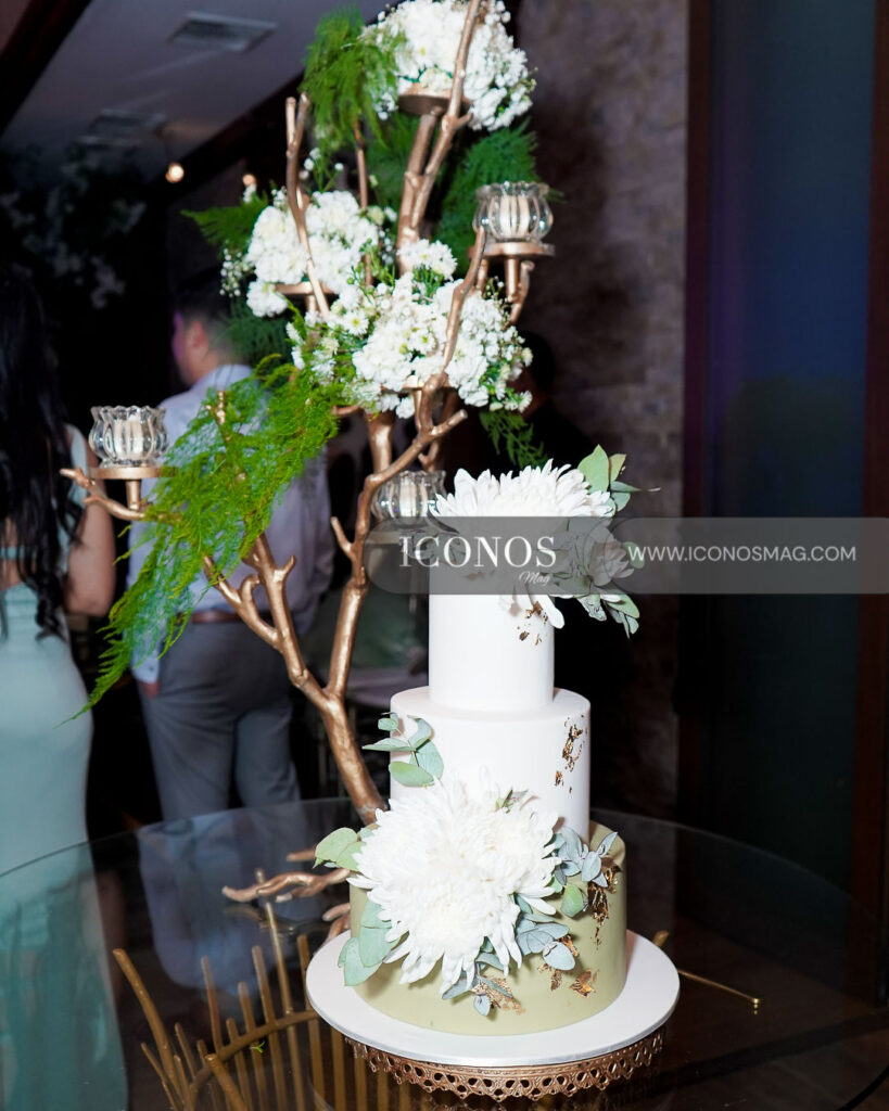 Para el display, se ha dispuesto mesas rectangulares y sillas Tiffany golden. Durante la recepción, han degustado un exquisito cake de tres niveles adornado con hortensias y follaje green.
