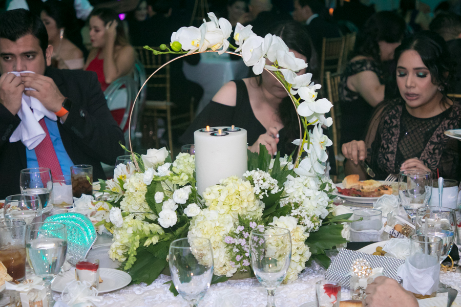 Denesse Gonzales diseñó cada espacio y María Dolores Uclés de Rápalo con los floristas de Casa, jardín y más, crearon los ornamentos florales con rosas, hortensias, aster silvestre y follaje, así como diferentes elementos a base de cristal y organiza.[/vc_column_text][thb_gap height=»30″][thb_image alignment=»center» image=»75442″][vc_column_text]