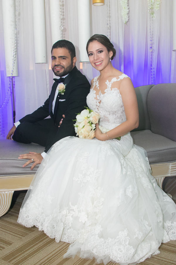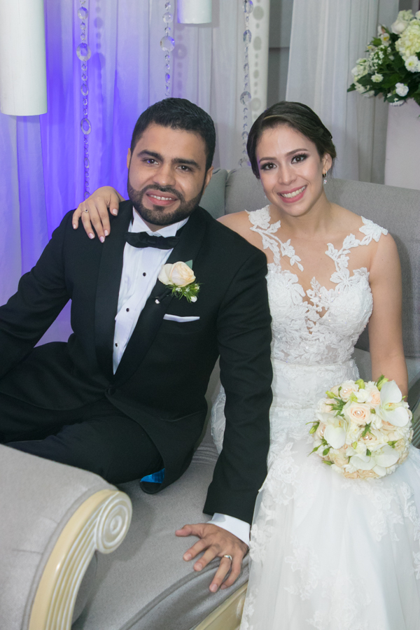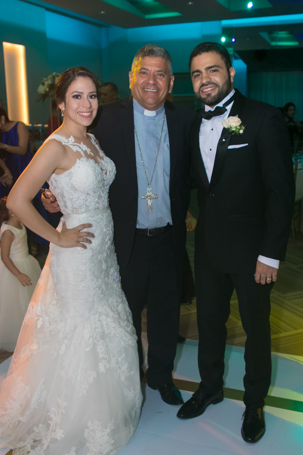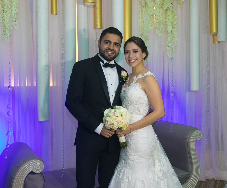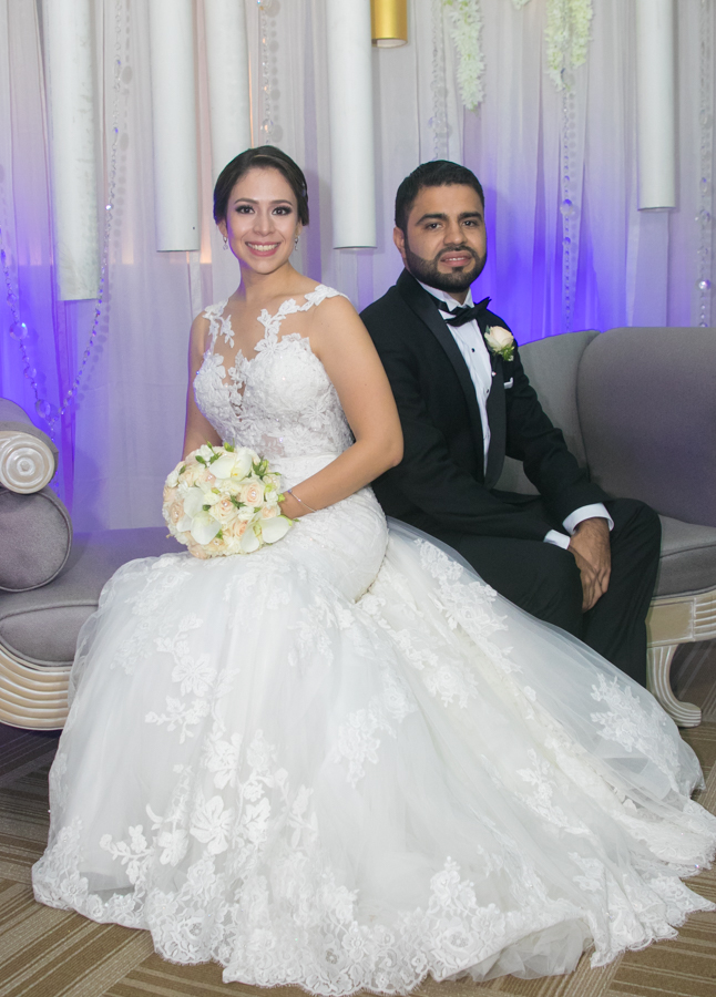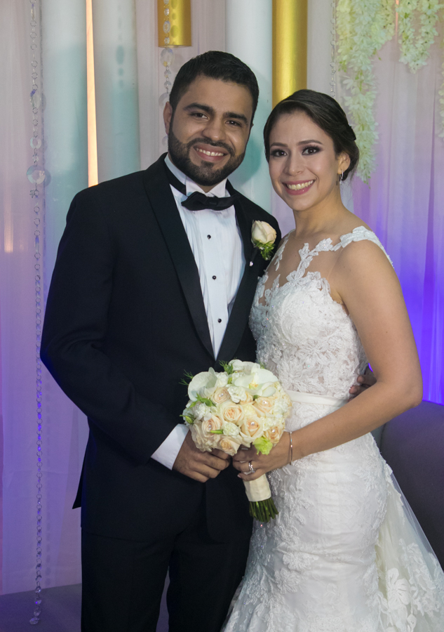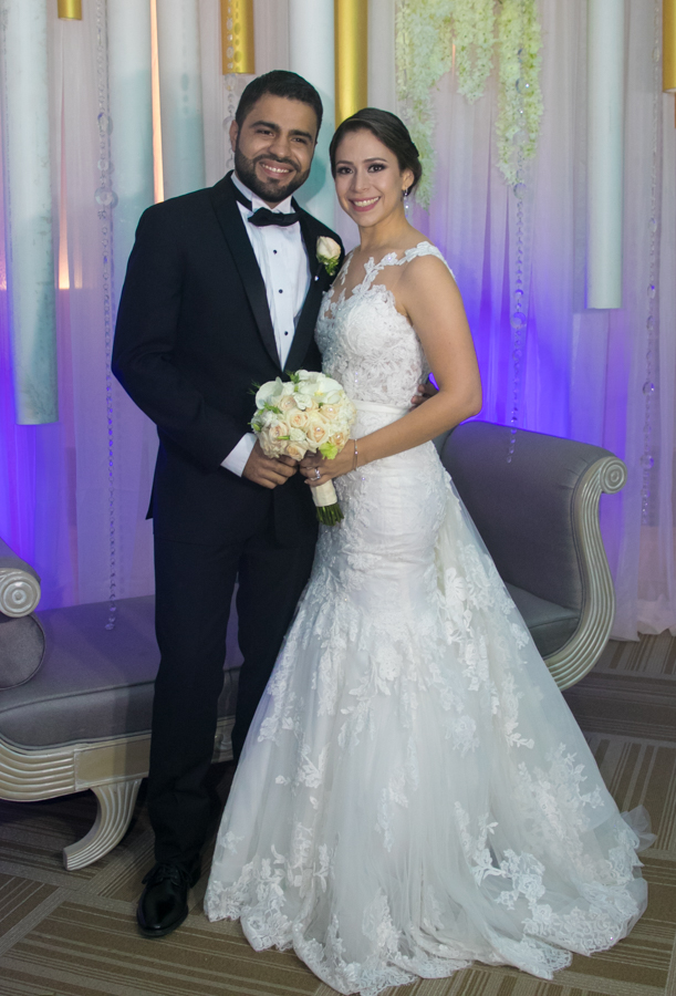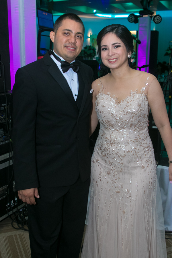 Ella, ataviada con un Pronovias de España. Él, de riguroso tuxedo. Así de elegantes y sumamente felices, reciben la bendición nupcial tras cerca de tres años de noviazgo oficial
