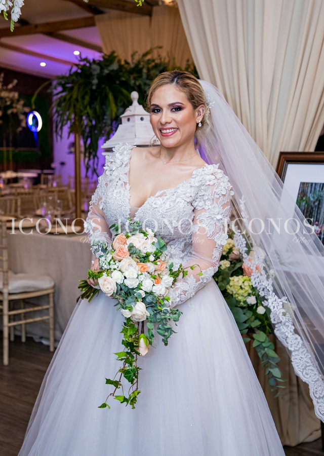Lo ha combinado con un hermoso velo en tul de corte catedral y un clásico bouquet en diseño cascada. El novio, de elegante tuxedo azul noche que lo ha hecho lucir perfecto para la ocasión.