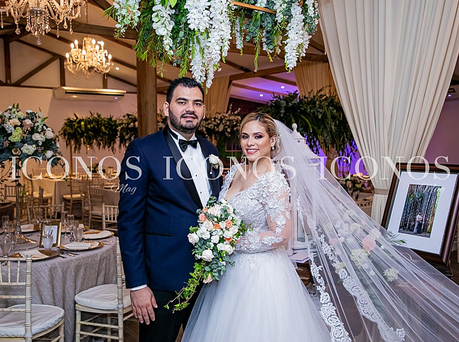 Lo ha combinado con un hermoso velo en tul de corte catedral y un clásico bouquet en diseño cascada. El novio, de elegante tuxedo azul noche que lo ha hecho lucir perfecto para la ocasión.