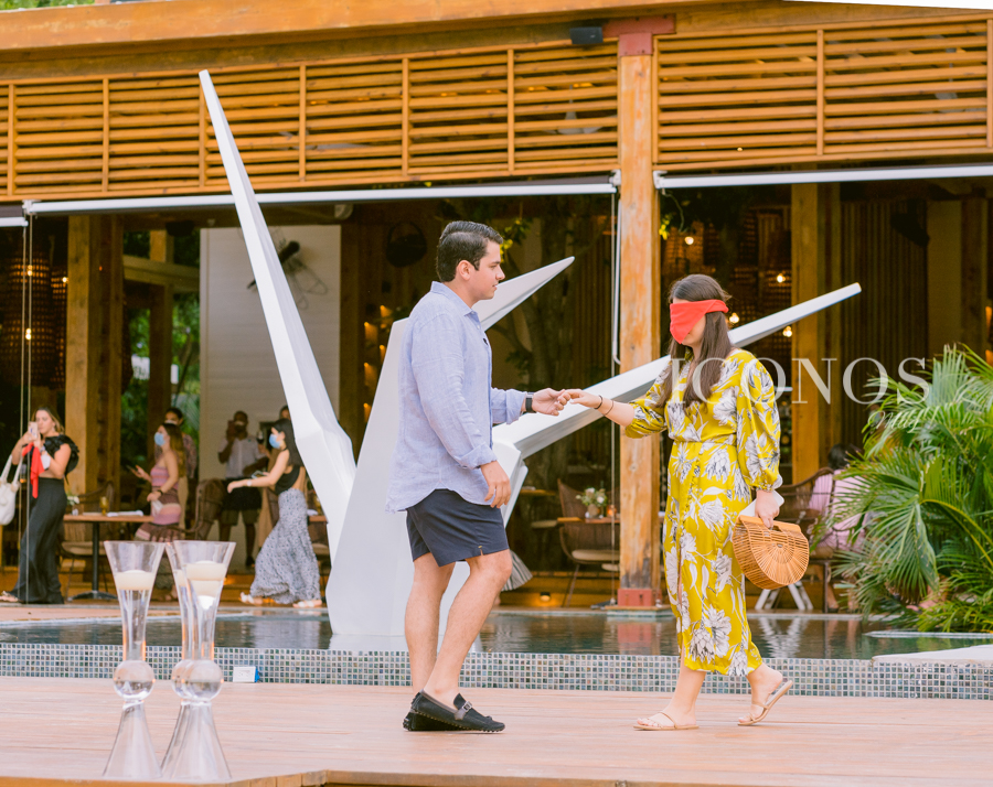Finalmente, con los ojos vendados, la futura esponsal fue recibida y sorprendida por su prometido, quien de rodillas le preguntó ¿querés casarte conmigo?