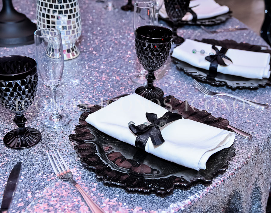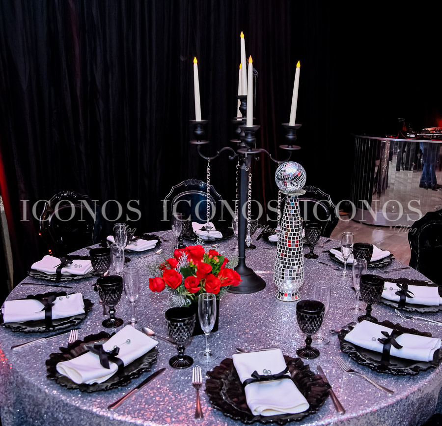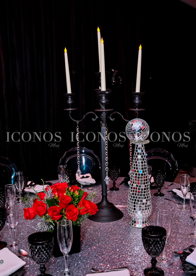 Además, se han escogido mesas circulares en donde candelabros en tono black mate han destacado con minibolas de disco.