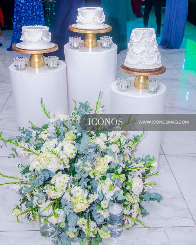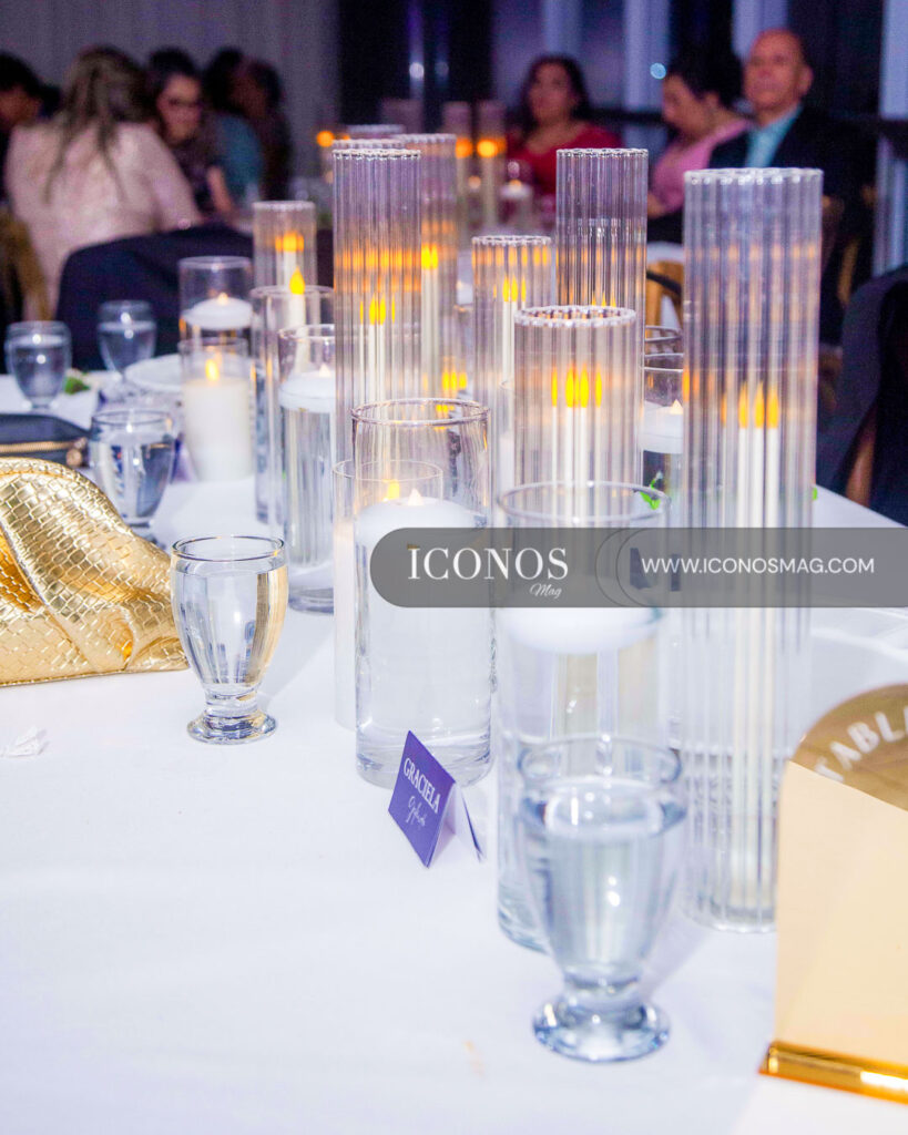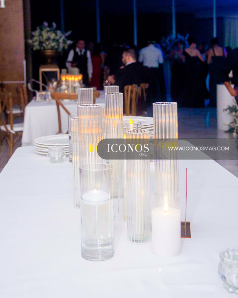 La floral designer Jackeline Cabrera ha creado una puesta en escena con gypsophila, rosas white y follaje green. Incluyendo velas eternas.