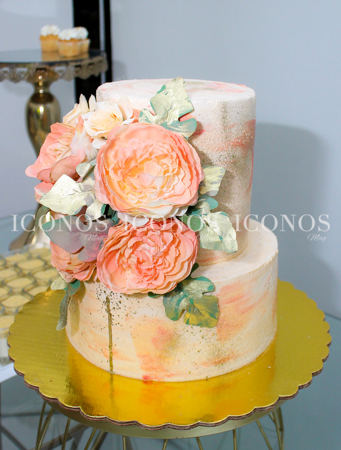 El cake ha sido de dos pisos en crema chantilly con difuminado en tonos orange y flores primaverales.