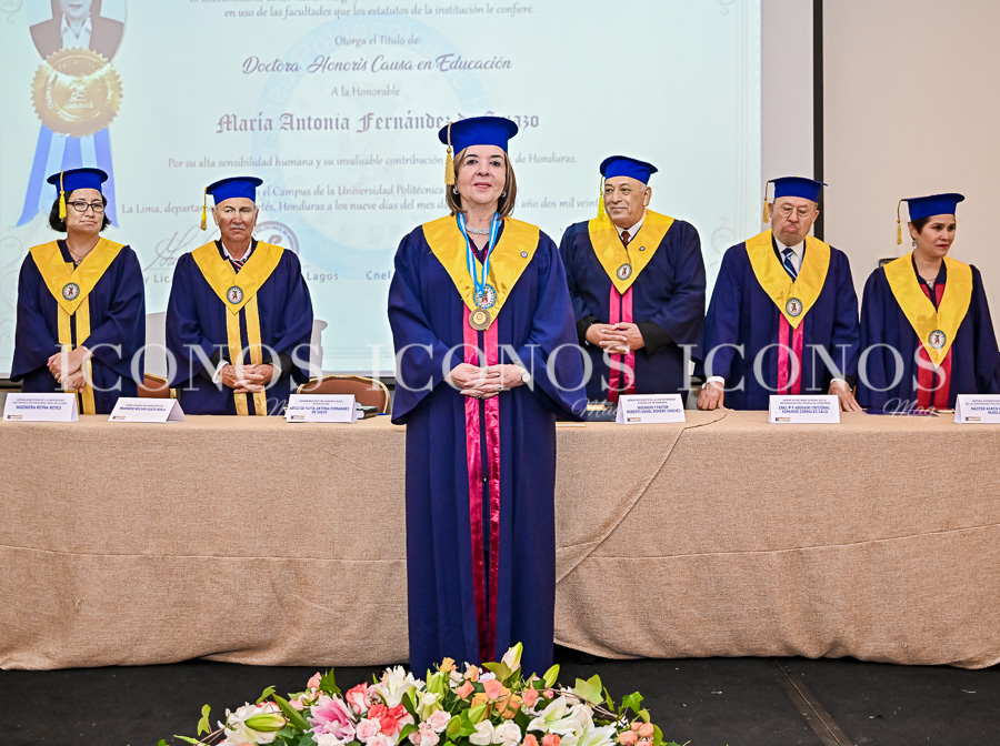 «Mi alegría es inconmensurable porque tengo la dicha de recibir este histórico reconocimiento: el doctorado Honoris Causa cuyo significado en latín es por causa de honor. Lo acepto con mi corazón colmado de gratitud y comprometido en seguir fortaleciendo el desarrollo de mi amada Honduras a través de la educación y el trabajo honesto«