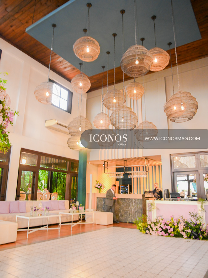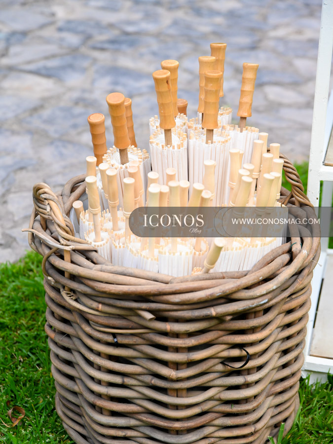 El display ha incluido sillas de Ratán, Crossback, mesas de madera y salas lounge. Además, acentos florales en tonos primaverales, lámparas Chandelier, abanicos y sombrillas personalizadas. El cake de bodas es regalo de Elsa de Milla.